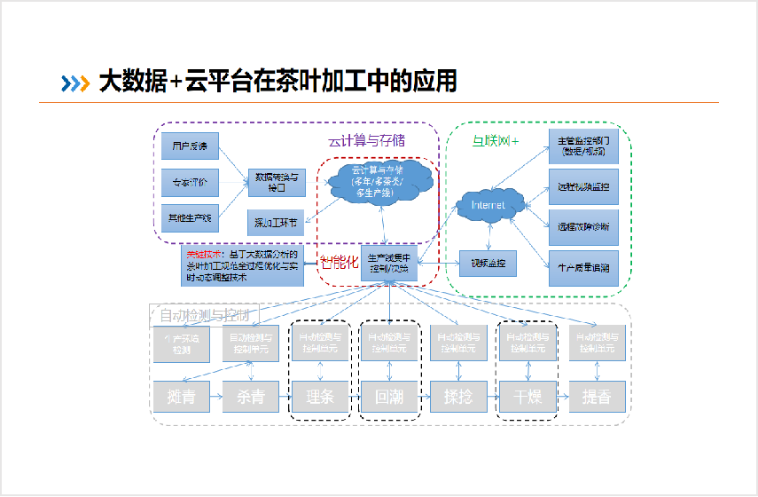 控制系統(tǒng)通過對茶葉加工生產(chǎn)線數(shù)字化管理與數(shù)據(jù)處理技術(shù)的研究,進(jìn)一步提升茶葉加工生產(chǎn)線的數(shù)字化管理水平,并通過加工品質(zhì)在線監(jiān)測與反饋實現(xiàn)一葉一策的加工模式,通過加工大數(shù)據(jù)的處理與分析為工藝優(yōu)化與設(shè)備改進(jìn)提供支撐。
