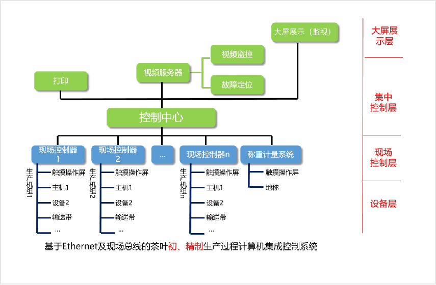 控制系統(tǒng)采用網(wǎng)絡(luò)技術(shù)及現(xiàn)場總線技術(shù),分為大屏展示(監(jiān)視)層、集中控制層、現(xiàn)場控制層和設(shè)備層共四級。系統(tǒng)通過網(wǎng)絡(luò),將現(xiàn)場控制單元進行互聯(lián),將所有數(shù)據(jù)集中到總控計算機上,從而形成對整條生產(chǎn)線的控制以及生產(chǎn)參數(shù)與報表的匯總,并把相關(guān)的展示信息和畫面監(jiān)控信息投送大屏展示層,具備傳輸信號容量大、實時性強的特點。